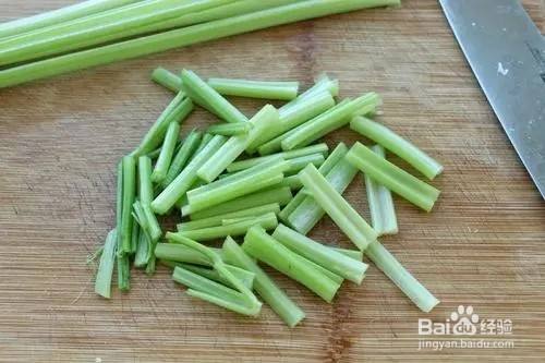 芹菜摘去叶子,清洗后沥水,切成段备用。