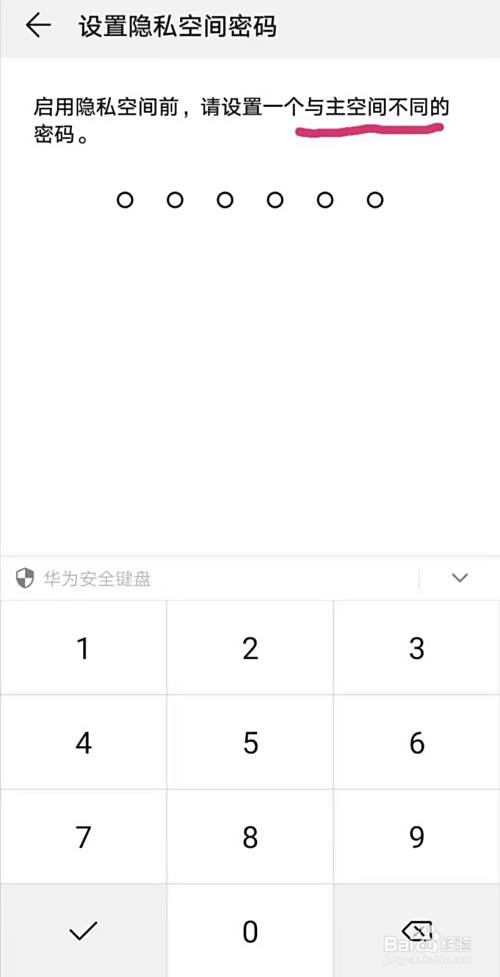 输入主空间密码之后,会出现设置隐私空间密码的界面,需要注意的是,这个密码要与主空间的密码不同