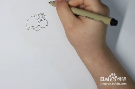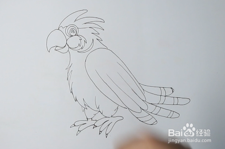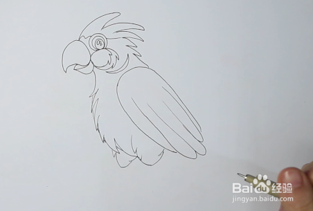 顺着画出鹦鹉的头部,头顶的羽毛也画出来;