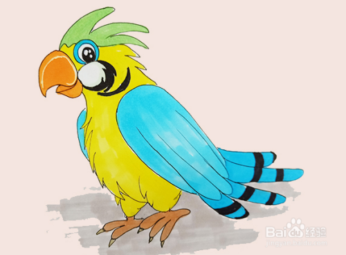 最后用彩笔给鹦鹉上色,鹦鹉的羽毛可以涂成多种彩色,灰色涂一层地面。