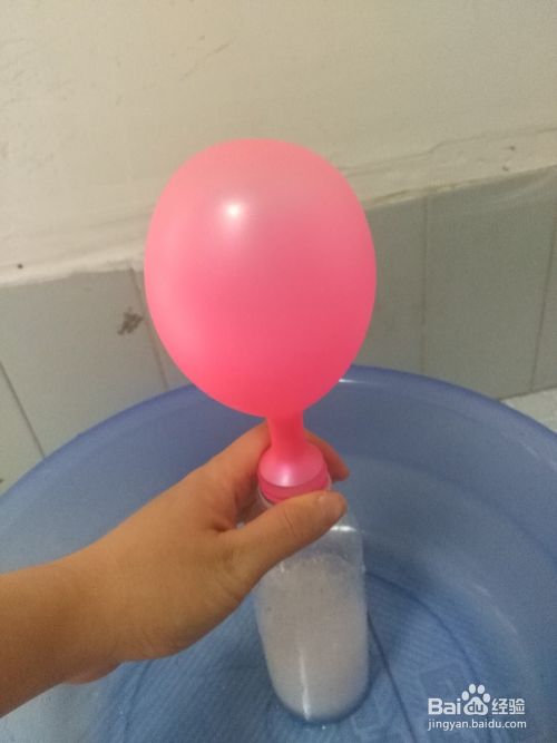 用手捏住瓶口,把气球拿起来,让小苏打粉掉进瓶子里。你会看到气球逐渐变大,听到瓶子里有滋滋的声音