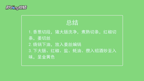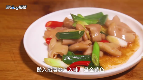 下大肠、红椒、盐、蚝油,放入绍酒,炒至入味,呈金黄色即可。