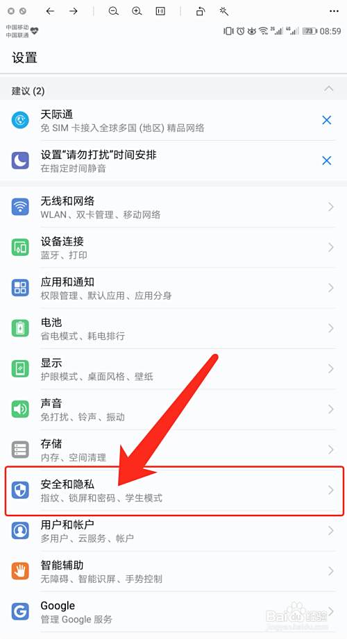在【设置】,点击【安全和隐私】。