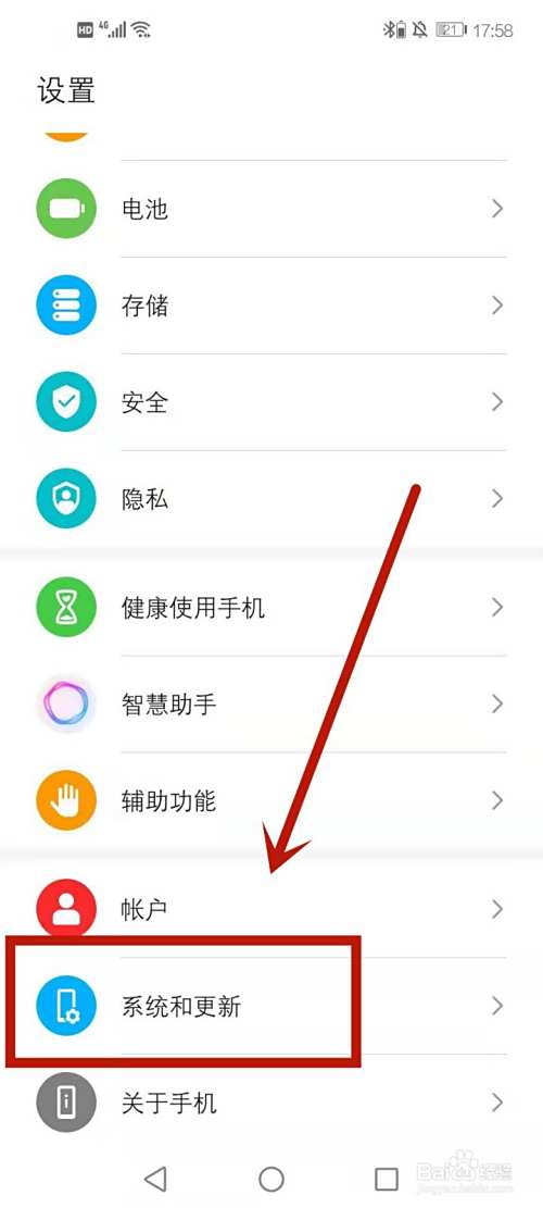 在华为手机设置页面中,找到系统和更新选项进入。