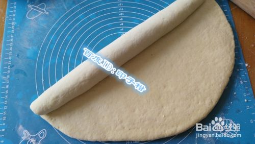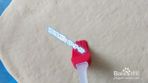 将排好气的面团用擀面杖擀开,擀开后用刷子在表面刷一层清水,再慢慢卷起。