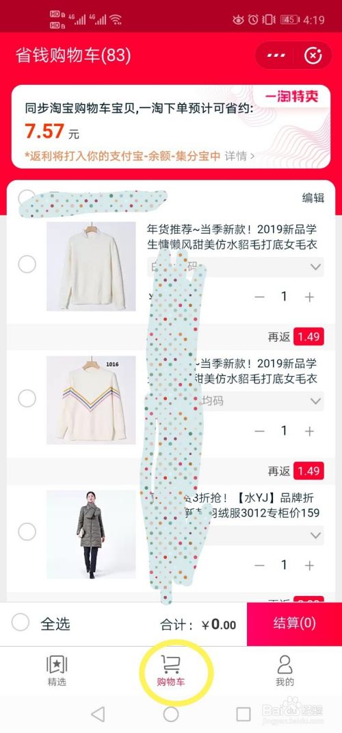 点击下方3个菜单中间的“购物车”,会同步你的淘宝购物车。