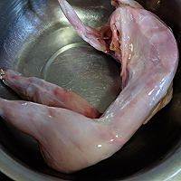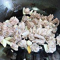 炒锅上火烧热,放入食用油,放蒜片炒香,再放进处理过的兔肉,翻炒;