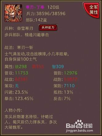 战法介绍:士气满发动,攻击敌横排,小几率眩晕,自身保留100士气