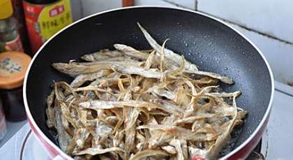 5、放入泡过的刨花鱼,中火翻炒至金黄。