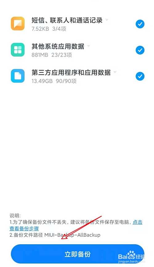 小米手机要备份所有数据,可以进入设置页面,点击备份与恢复,选择所有数据,点击备份即可。