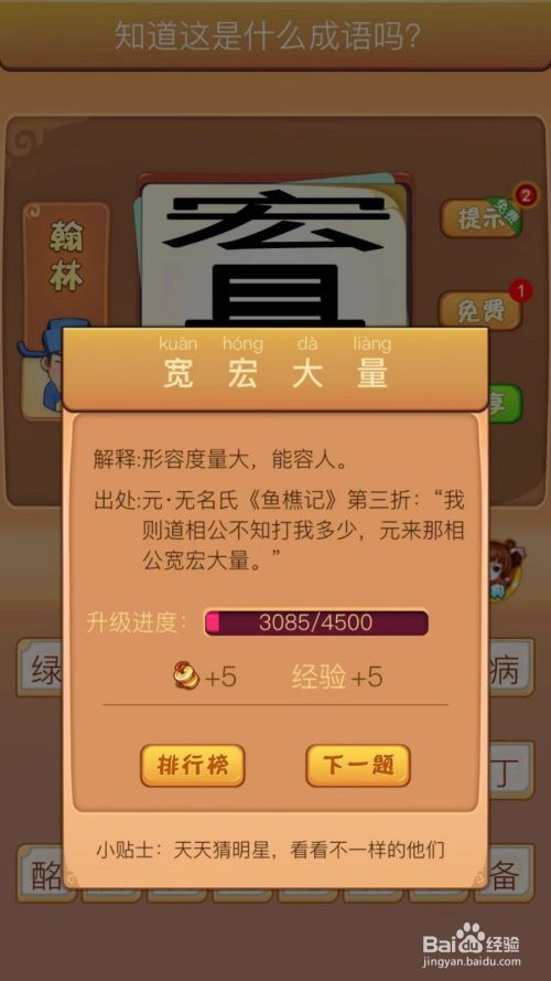 图片中有两个字,上面的字特别的宽,下面的字特别的大,再加上含有这两个字的成语,我们可以猜到的是宽宏大量,