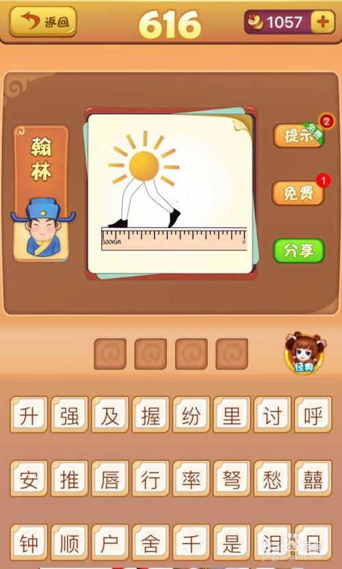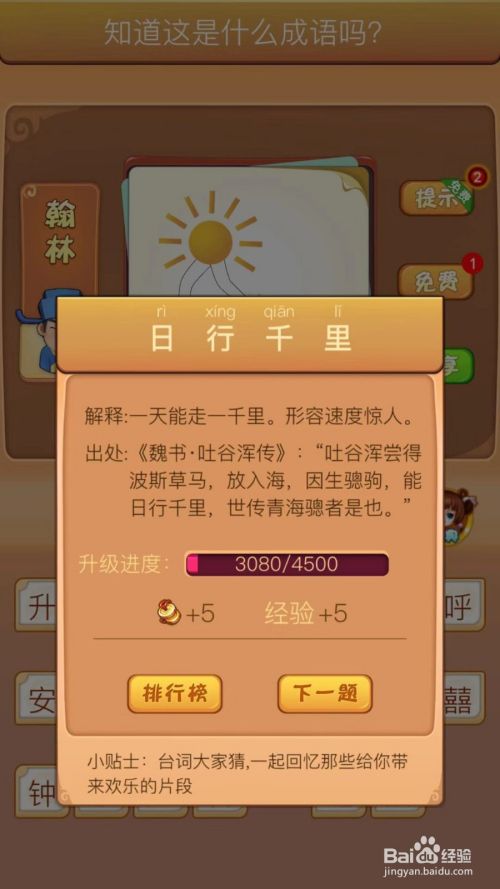 图片中有一个人在走路,他身上有一个太阳,表示一天的意思,下面有把尺子表示他走了一千里,所以这个成语是日行千里,