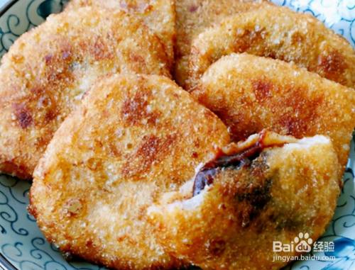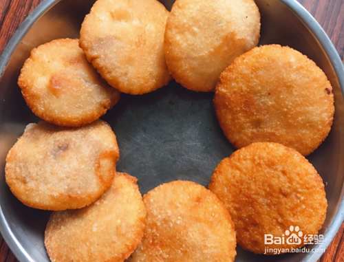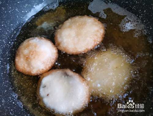 按照此方法将油炸糕的胚子都做好,下面准备炸油糕,在锅中添上比较多的食用油,烧至6成热,将油糕逐个下入锅中,全程中小火慢炸;