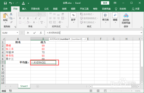 操作:点击选中B7单元格,输入公式= AVERAGE(