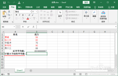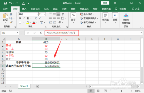 另一个例子:计算大于80的平均值,大于80的单元格有B2、B5、B6。