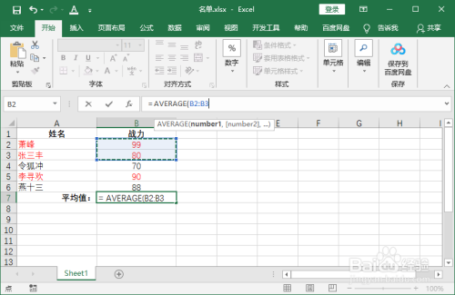 鼠标拖动选中B2和B3,公式变为= AVERAGE(B2:B3