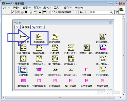 在字符串子选板中,选择连接字符串子函数,然后将其放置到程序框图的合适位置;