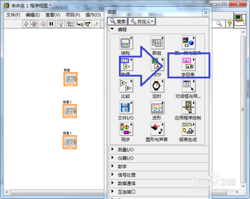 单击鼠标右键,打开函数选板,然后再选择打开字符串子选板;