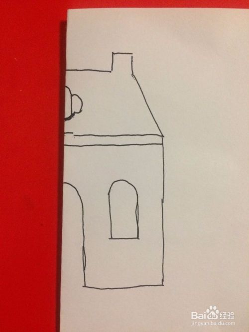 首先把纸对折起来,在折叠处画上小房子的图案。