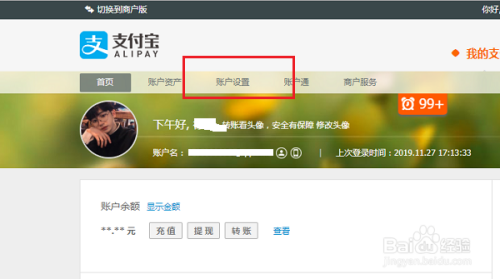 第三步登录成功之后,点击账户设置,需要注意的是,进去支付宝个人版,如果进去了商家版,切换到个人版这里,如下图所示: