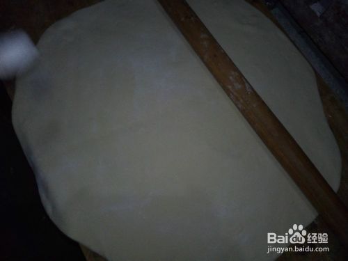 用擀面杖把面块擀成一个大面片。圆形的,几乎占领整个面板。宽度。
