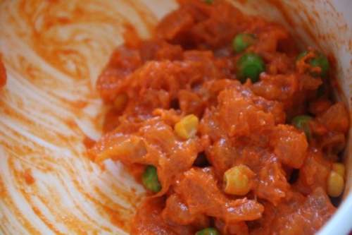 2鸡肉丁中加入青豆和玉米粒,撒上奥尔良腌料腌制2小时以上。
