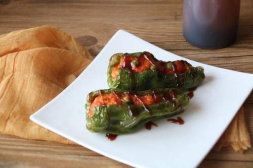 4将腌制好的肉丁填入青椒中。