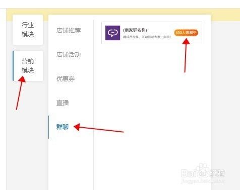 在创建模版页面,点击左侧的“营销模块”---“群聊”---找到“群聊模块”!如图所示!