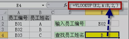 E4单元格输入公式:=VLOOKUP(E2,A:B,2,)