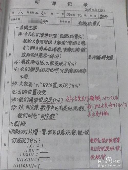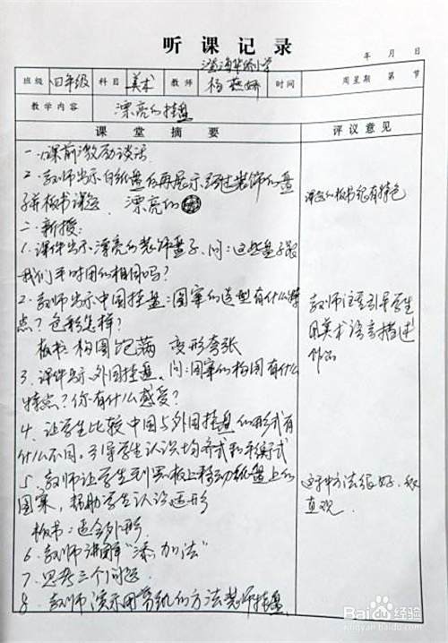 记教法学法。授课人用什么方法解决难点、突破难点,学生的那些学习方法让我们耳目一新,这些在我们的听课记录上都要有明显的记载。