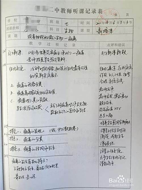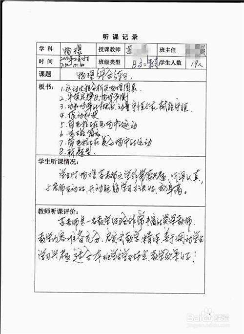 记听课时间、地点、班级、授课人姓名、课题名称、听课性质等,以便以后翻阅时有助于研究。