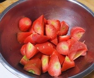 羊肉凉水浸泡一个小时,把血水拔出来后,沥干放入高压锅内,加水到半锅,水量把握主要是看食材多少,基本上是总食材的两倍。