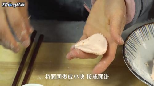 2将面团揪成小块,按成面饼。