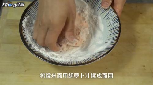 1将糯米面用胡萝卜汁揉成面团。