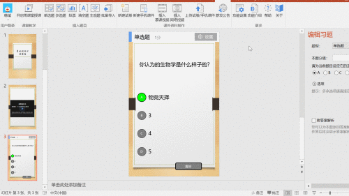 在习题区随便选择题型,插入课件,在课件内编辑习题内容及选项和答案/解析。用于检验学生预习的效果。
