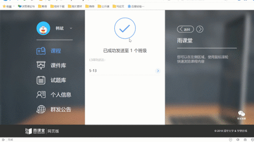 点击雨课堂手机端或者网页版的课程选项,选择自己要发布课件的班级,点击发布>发布课件,选择刚刚上传的课件库中的课件,发布成功!