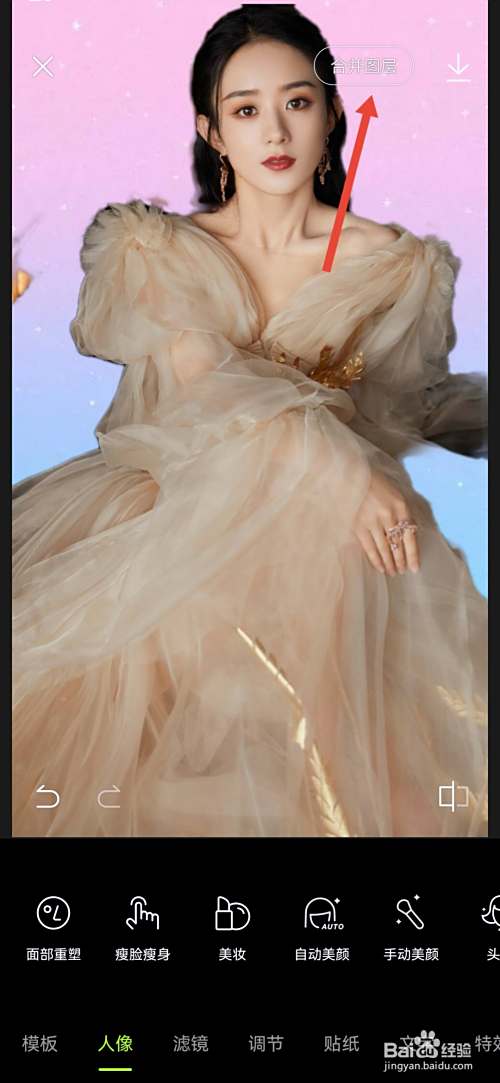 点击右上角的“合并图层”,这样两个图片就合并在一起了,然后点击保存图片就完成了,这样就可以用醒图把抠出来的图放到另一张图上了。