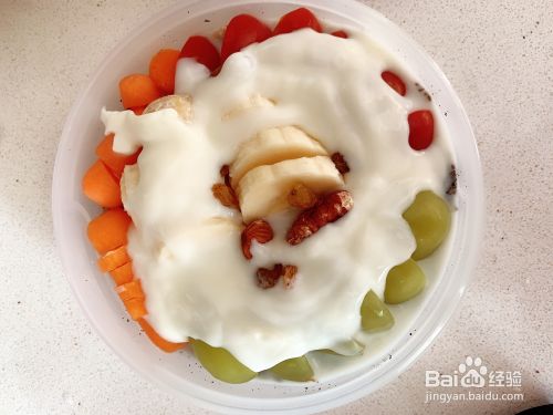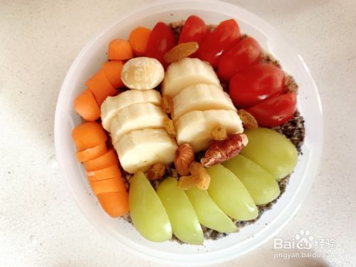 我放了一些葡萄干,樱桃,胡萝卜,香蕉,葡萄干,核桃(水果和核桃是你最喜欢的,但是为了减少脂肪,尽量选择一些低糖的水果;像火龙果,蓝莓,苹果可以加入;)