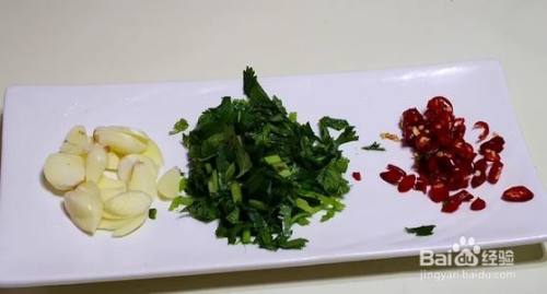 香菜洗净,切成段;蒜切成片;红米椒洗净,切成圈。