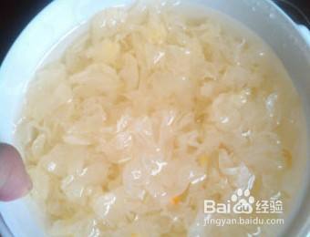 银耳放在温水中泡发,摘成小朵,入沸水焯3分钟后,捞出沥水。