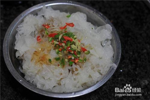 锅内放少许油,倒入蒜片、米椒圈炒香,浇在银耳上,拌匀。