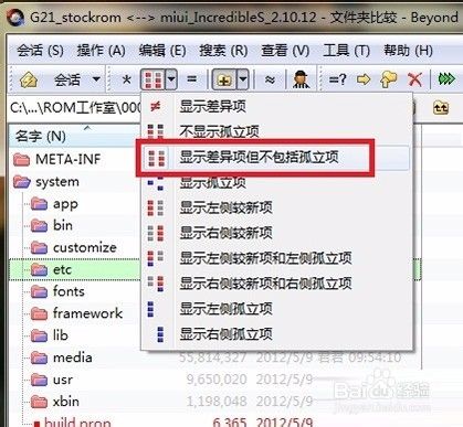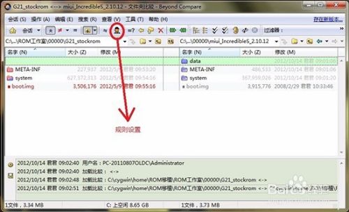 分别把以上两个rom包解压到同一个文件夹里面,然后打开BCompare对比软件,把解压后得到的miui_IncredibleS_2.10.12和G21_stockrom文件夹拉到BCompare进行比对,请把G21_stockrom放到左侧,把miui_IncredibleS_2.10.12放到右侧
