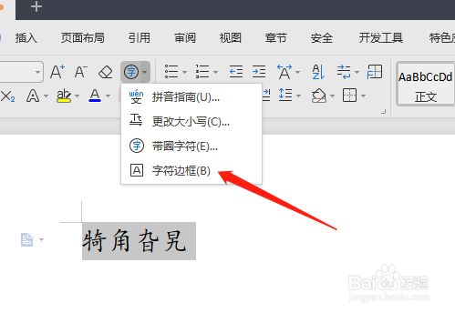 打开WPS文档,选中要添加字符边框的文字,点击“拼音指南下拉按钮”。