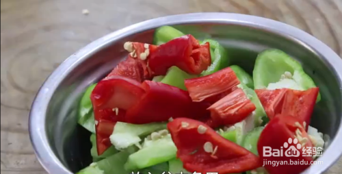 青椒两个去蒂以后切成滚刀块,红椒一个确定切成滚刀块放入盆中备用