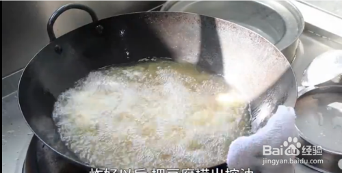 因为内酯豆腐非常的软嫩易碎,为了便于下面的操作,我们把豆腐过油炸一下,锅里烧油,油温烧至5成热在炸,然后一次下入豆腐炸至金黄,炸好以后把豆腐捞出.
