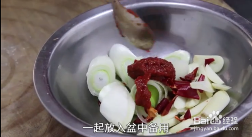 大蒜几粒切成蒜片,葱白一段切成马蹄片,干辣椒三克准备辣椒酱10克,一起放入盘中备用