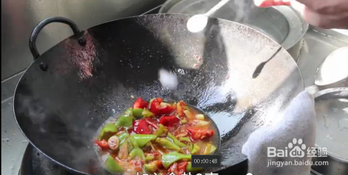 控油锅中留底油,到处准备好的配菜.倒出香味,炒下以后到了青红椒继续翻炒,从锅边加入少量的清水,下面我们开始调味,加入食盐两克鸡配一克,胡椒粉一克,白糖一克,生抽5克,老抽两克,汤汁烧开以后勾出少于水淀粉,把汤汁收着.