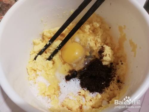 玉米粉放入盆中,用70°左右的水烫一下,放入白糖,红糖,磕入1个鸡蛋,放入酵母。