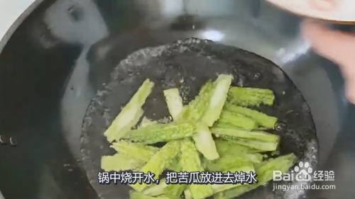 锅中烧开水,把苦瓜放进去焯水,焯水的时候放入两勺糖,这样苦瓜的苦味就会淡很多,苦瓜焯至断生后捞出来过凉,过凉后将沥干水分放入碗中。