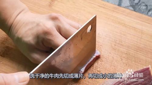 洗干净的牛肉先切成薄片,再切成小的薄片,切好放入碗中备用。